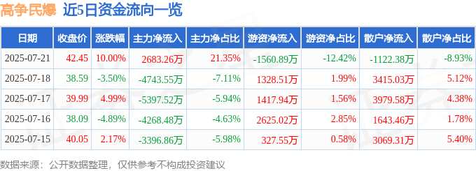 摘要: 消息,高爭民爆7月21日漲停收盤,收盤價(jià)42.45元。該股于9點(diǎn)25分漲停,未打開漲停,截止收盤封單資金為13.51億元,占其流通市值11.53%。7月21日的資金流向數(shù)據(jù)方面,