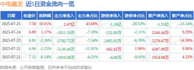 摘要: 消息,中電鑫龍7月25日漲停收盤(pán),收盤(pán)價(jià)7.58元。該股于9點(diǎn)32分漲停,未打開(kāi)漲停,截止收盤(pán)封單資金為1.39億元,占其流通市值2.81%。7月25日的資金流向數(shù)據(jù)方面,主力資金凈流入2.47億元,