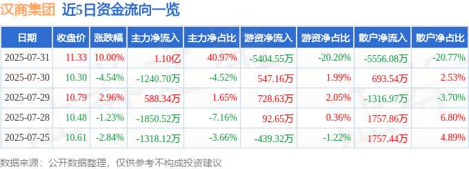消息,漢商集團(tuán)7月31日漲停收盤,收盤價(jià)11.33元。該股于9點(diǎn)25分漲停,未打開漲停,截止收盤封單資金為3655.95萬元,占其流通市值1.09%。