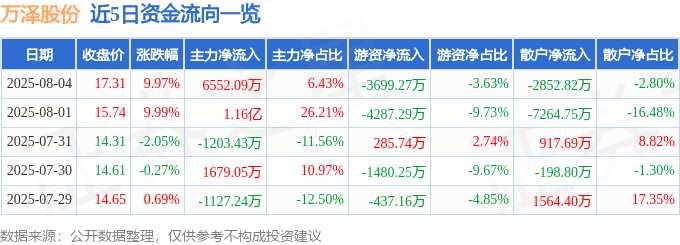 摘要: 消息,萬澤股份8月4日漲停收盤,收盤價(jià)17.31元。該股于9點(diǎn)34分漲停,1次打開漲停,截止收盤封單資金為7311.69萬元,占其流通市值0.85%。8月4日的資金流向數(shù)據(jù)方面,