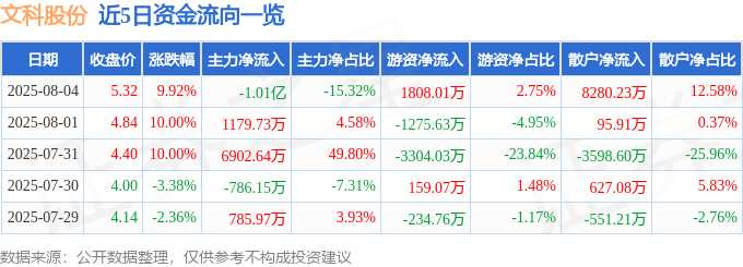 摘要: 消息,文科股份8月4日漲停收盤,收盤價(jià)5.32元。該股于9點(diǎn)30分漲停,4次打開漲停,截止收盤封單資金為4532.66萬元,占其流通市值1.92%。8月4日的資金流向數(shù)據(jù)方面,