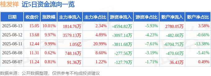 消息,桂發(fā)祥8月13日漲停收盤,收盤價(jià)15.05元。該股于9點(diǎn)30分漲停,1次打開漲停,截止收盤封單資金為3537.11萬元,占其流通市值1.17%。