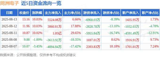 摘要: 消息,同洲電子8月13日漲停收盤,收盤價(jià)13.16元。該股于9點(diǎn)25分漲停,6次打開漲停,截止收盤封單資金為8705.76萬元,占其流通市值0.96%。8月13日的資金流向數(shù)據(jù)方面,