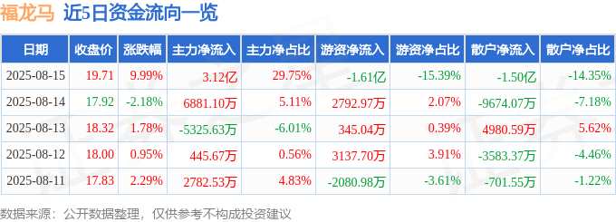 摘要: 消息,福龍馬8月15日漲停收盤,收盤價(jià)19.71元。該股于9點(diǎn)34分漲停,3次打開漲停,截止收盤封單資金為7208.3萬(wàn)元,占其流通市值0.88%。8月15日的資金流向數(shù)據(jù)方面,