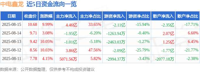 摘要: 消息,中電鑫龍8月15日漲停收盤,收盤價10.68元。該股于9點32分漲停,2次打開漲停,截止收盤封單資金為2.01億元,占其流通市值2.89%。8月15日的資金流向數(shù)據(jù)方面,