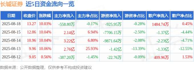 消息,長城證券8月18日漲停收盤,收盤價13.27元。該股于9點30分漲停,1次打開漲停,截止收盤封單資金為2.33億元,占其流通市值0.5%。