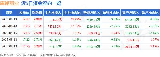 摘要: 消息,康緣藥業(yè)8月19日漲停收盤,收盤價(jià)19.83元。該股于9點(diǎn)30分漲停,5次打開漲停,截止收盤封單資金為4393.85萬元,占其流通市值0.39%。8月19日的資金流向數(shù)據(jù)方面,
