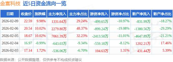 摘要: 消息,金富科技2月9日漲停收盤(pán),收盤(pán)價(jià)22.59元。該股于9點(diǎn)25分漲停,未打開(kāi)漲停,截止收盤(pán)封單資金為1.47億元,占其流通市值6.64%。2月9日的資金流向數(shù)據(jù)方面,