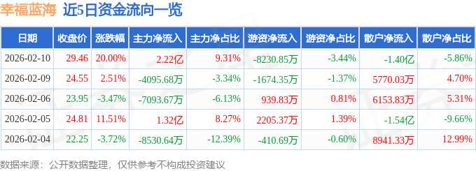 消息,幸福藍(lán)海2月10日漲停收盤,收盤價(jià)29.46元。該股于11點(diǎn)9分漲停,2次打開漲停,截止收盤封單資金為1.09億元,占其流通市值0.99%。