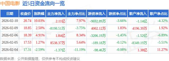 摘要: 消息,中國(guó)電影2月10日漲停收盤,收盤價(jià)20.74元。該股于10點(diǎn)58分漲停,未打開漲停,截止收盤封單資金為2.95億元,占其流通市值0.76%。2月10日的資金流向數(shù)據(jù)方面,