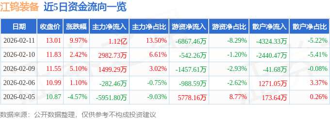 摘要: 消息,江鎢裝備2月11日漲停收盤,收盤價(jià)13.01元。該股于9點(diǎn)52分漲停,2次打開漲停,截止收盤封單資金為3747.4萬元,占其流通市值0.29%。2月11日的資金流向數(shù)據(jù)方面,