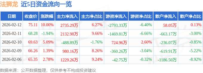 摘要: 消息,法獅龍2月12日漲停收盤,收盤價(jià)75.11元。該股于13點(diǎn)21分漲停,1次打開漲停,截止收盤封單資金為3159.13萬元,占其流通市值0.33%。2月12日的資金流向數(shù)據(jù)方面,