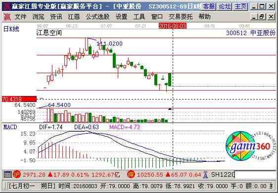 300512股票分析綜合評論:中亞股份300512當前趨勢運行在生命線以下弱勢休息區(qū)域,通過江恩價格工具分析,該股短期支撐是79.04元,阻力是80.3元;通過江恩時間工具分析,該股短期時間窗為 2016-07-12號和2016-08-02號,中期時間窗2016-08-23號和2016-09-26號 ,結合持倉成本做好計劃。