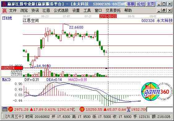 002326股票分析綜合評論:永太科技002326當前趨勢運行在生命線以下弱勢休息區(qū)域,中期資金籌碼占流通盤36.81%,主力控盤度較高大方向依然樂觀。通過江恩價格工具分析,該股短期支撐是17.44元,阻力是19.38元;通過江恩時間工具分析,該股短期時間窗為 2016-07-18號和2016-08-08號,中期時間窗2016-08-29號和2016-10-02號 ,結(jié)合持倉成本做好計劃。