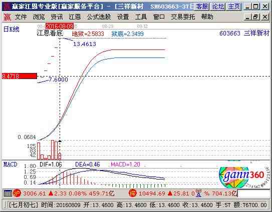 603663股票分析綜合評論:三祥新材603663當(dāng)前趨勢運行在生命線以上強勢可操作區(qū)域,通過江恩價格工具分析,該股短期支撐是11.4元,阻力是12.35元;通過江恩時間工具分析,該股短期時間窗為 2016-08-21號和2016-09-11號,中期時間窗2016-10-02號和2016-11-05號 ,結(jié)合持倉成本做好計劃。
