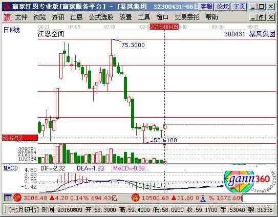 300431股票分析綜合評論:暴風集團300431當前趨勢運行在生命線以下弱勢休息區(qū)域,中期資金籌碼占流通盤120%,主力控盤度較高大方向依然樂觀。通過江恩價格工具分析,該股短期支撐是57.08元,阻力是64.22元;通過江恩時間工具分析,該股短期時間窗為 2016-05-16號和2016-06-06號,中期時間窗2016-06-27號和2016-07-31號 ,結合持倉成本做好計劃。