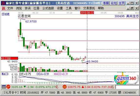 300495股票分析綜合評論:美尚生態(tài)300495當(dāng)前趨勢運(yùn)行在生命線以下弱勢休息區(qū)域,通過江恩價格工具分析,該股短期支撐是42.02元,阻力是47.27元;通過江恩時間工具分析,該股短期時間窗為 2016-04-14號和2016-05-05號,中期時間窗2016-05-26號和2016-06-29號 ,結(jié)合持倉成本做好計劃。