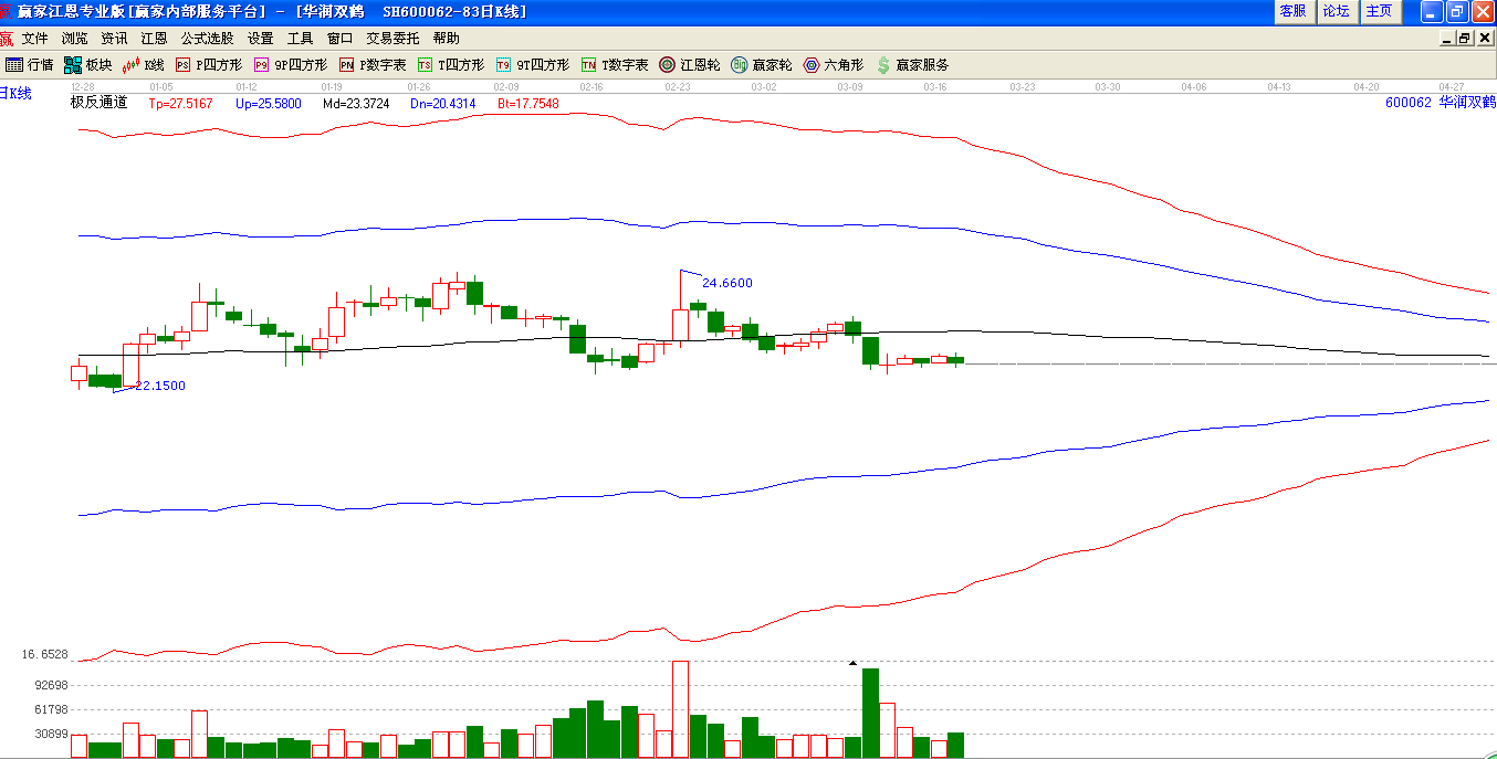 根據(jù)贏家江恩星級評定模型:600062股票分析綜合評論:華潤雙鶴600062當前趨勢運行在生命線以下弱勢休息區(qū)域,中期資金籌碼占流通盤64.92%,主力控盤度較高大方向依然樂觀。通過江恩價格工具分析,該股短期支撐是22.68元,阻力是25.52元;通過江恩時間工具分析,該股短期時間窗為 2017-02-16號和2017-03-09號,中期時間窗2017-03-30號和2017-05-03號 ,結合持倉成本做好計劃。