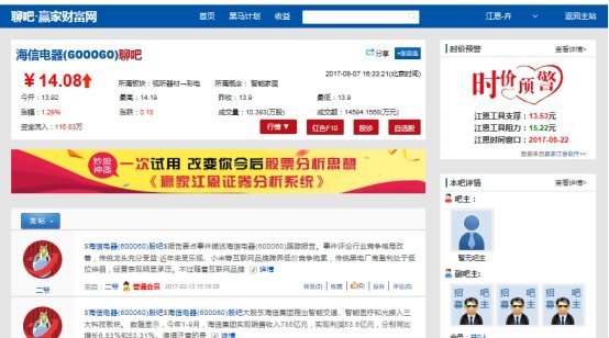 贏家聊吧是贏家財富網(wǎng)旗下的股民社交平臺,在這里可以獲取持有個股的詳細信息,對于手中個股有任何疑問,也可以在線咨詢并與專業(yè)的投資人士互動。贏家聊吧針對每個指數(shù)及個股都有獨立的欄目,以海信電器吧為例。如下圖,海信電器吧涵蓋該股的詳細信息、時價預警、公司的重要消息等。注冊賬號后,對于該股有任何疑問的也可以直接發(fā)帖詢問,是散戶投資炒股的實戰(zhàn)樂園。