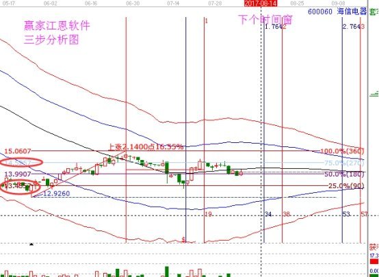 海信電器吧目前由贏家江恩分析團隊定期更新走勢分析,那當前該股走勢如何?未來漲跌空間及時間窗口在哪里?見下圖。當前,海信電器處于極反通道生命線下方弱勢區(qū),江恩百分比工具顯示下方支撐13.45,上方壓力13.99,下個時間窗口為豎著的1.764藍線對應日期為2017年8月14日。則,沒有買入此股的不要急于入場,關(guān)注回落13.45的低吸機會,穩(wěn)健者可以等放量突破黑色生命線,進入強勢區(qū)后再操作,在8月14日附近重點關(guān)注看短期是否給出更明確的方向選擇。