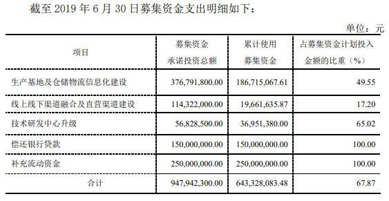 此前,公司公開(kāi)募集資金凈額為9.48億元。截至6月30日,已累計(jì)使用募集資金6.43億元,占募集資金計(jì)劃投入金額的比重為67.87%。募投項(xiàng)目分別是生產(chǎn)基地及倉(cāng)儲(chǔ)物流信息化建設(shè)、線(xiàn)上線(xiàn)下渠道融合及直營(yíng)渠道建設(shè)、技術(shù)研發(fā)中心升級(jí)、償還銀行貸款和補(bǔ)充流動(dòng)資金,累計(jì)使用募集資金分別為1.87億元、1966.16萬(wàn)元、3695.14萬(wàn)元、1.50億元、2.50億元。