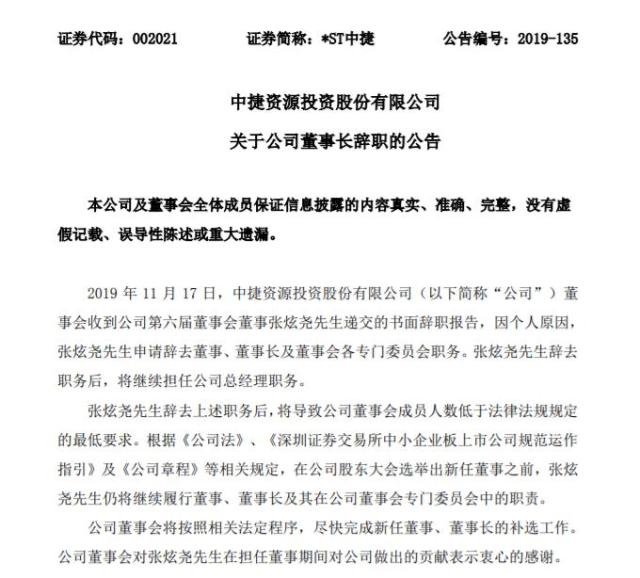 摘要: 18日早間,*ST中捷(原中捷股份)發(fā)布多則公告稱,11月17日,公司董事長(zhǎng)張炫堯因個(gè)人原因辭職,將繼續(xù)擔(dān)任公司總經(jīng)理職務(wù);獨(dú)立董事肖瑩、監(jiān)事秦琴、職工董事陳國強(qiáng)均因個(gè)人原因辭職。