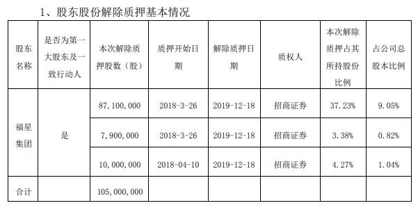 福星股份:福星集團(tuán)解除質(zhì)押1.05億股