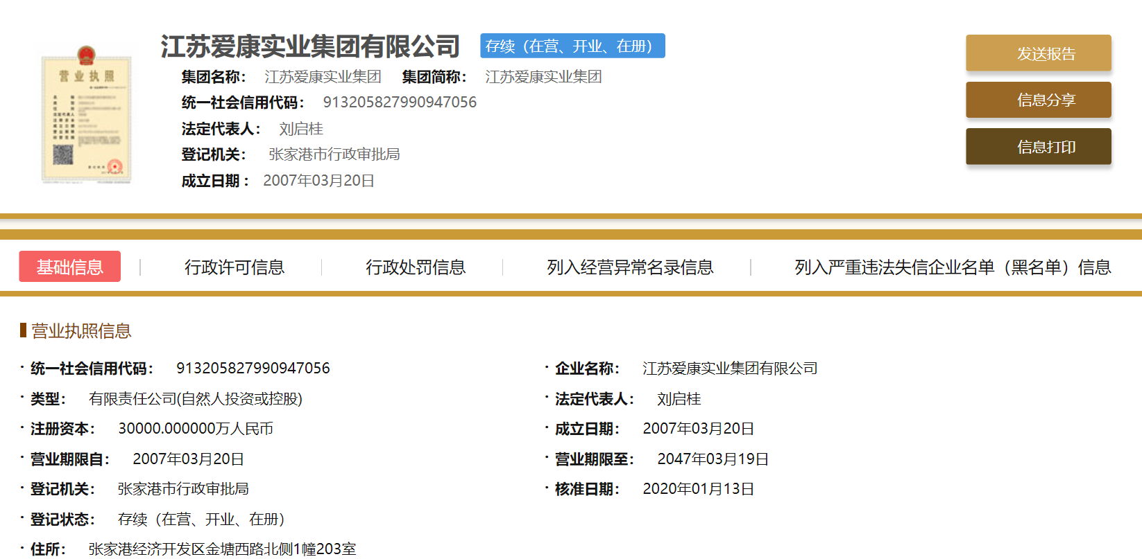 鄒承慧已卸任愛(ài)康集團(tuán)法定代表人。1月14日,企業(yè)信用信息公示系統(tǒng)獲悉,江蘇愛(ài)康實(shí)業(yè)集團(tuán)有限公司(下稱(chēng)“愛(ài)康集團(tuán)”)法定代表人已由鄒承慧變更為劉啟桂。
