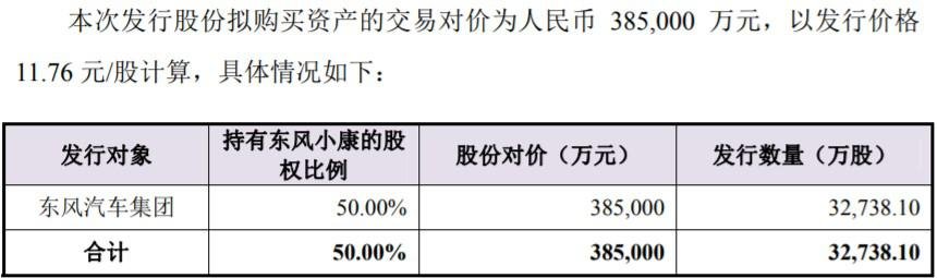 據(jù)了解,小康股份擬以11.76元/股價(jià)格,向東風(fēng)汽車集團(tuán)定向增發(fā)約3.27億股股票,作價(jià)約38。5億元,收購(gòu)其持有的東風(fēng)小康50%股權(quán),這樣,東風(fēng)小康成為小康股份全資子公司,而東風(fēng)汽車集團(tuán)成為小康股份二股東。