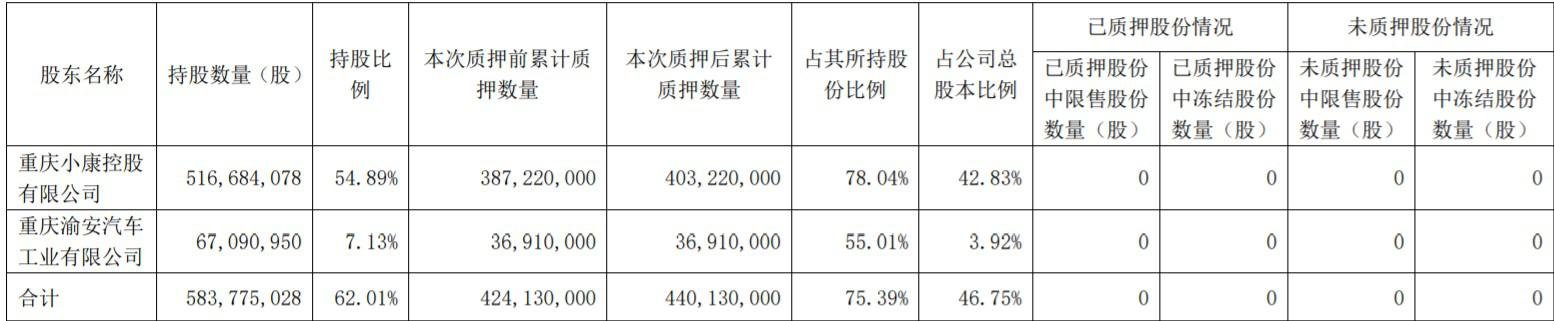 去年12月3日,小康股份發(fā)布關(guān)于控股股東股份質(zhì)押的公告,顯示控股股東小康控股于11月29日將其持有的小康股份1600萬(wàn)股無限售流通股質(zhì)押給重慶農(nóng)商行九龍坡支行。此次質(zhì)押股份占其持有公司股份的3.1%,占公司總股本的1.7%。根據(jù)公告,控股股東此次質(zhì)押融資資金用途為自身生產(chǎn)經(jīng)營(yíng)。