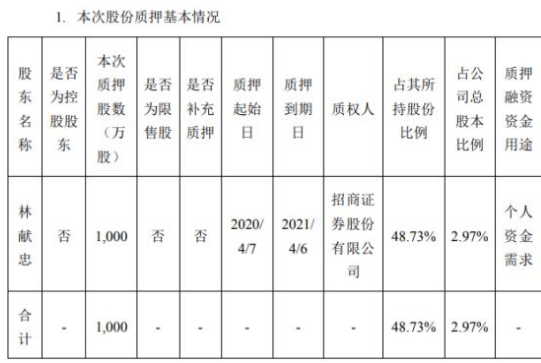 本次質(zhì)押股份1000萬股,占其所持公司股份的48.73%。質(zhì)押期限為2020年4月7日至2021年4月6日。