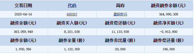 酒鋼宏興(600307)2020-04-16融資融券信息顯示,酒鋼宏興融資余額363,059,949元,融券余額1,930,356元,融資買入額8,221,038元,融資償還額11,133,938元,融資凈買額-2,912,900元,融券余量1,122,300股,融券賣出量20,000股,融券償還量196,000股,融資融券余額364,990,305元。酒鋼宏興融資融券詳細(xì)信息如下表: