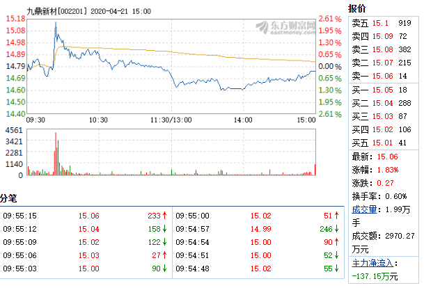 4月21日,九鼎新材盤中快速反彈,5分鐘內(nèi)漲幅超過2%,截至9點(diǎn)55分,報(bào)15.06元,成交2970.27萬元,換手率0.60%。