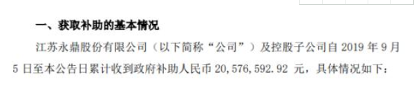 永鼎股份及控股子公司自2019年9月5日以來收到政府補助2057.66萬元