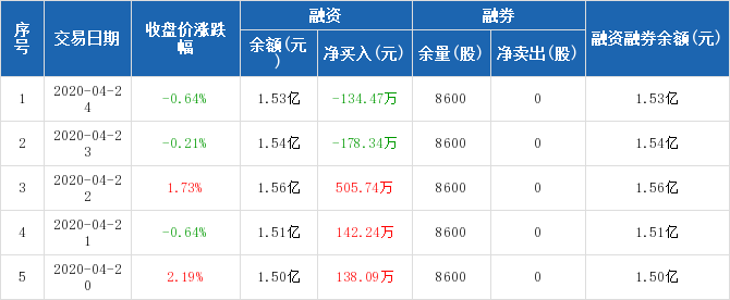 融資方面,當(dāng)日融資買入324.53萬(wàn)元,融資償還459萬(wàn)元,融資凈償還134.47萬(wàn)元。融券方面,融券賣出0股,融券償還0股,融券余量8600股,融券余額4.02萬(wàn)元。融資融券余額合計(jì)1.53億元。