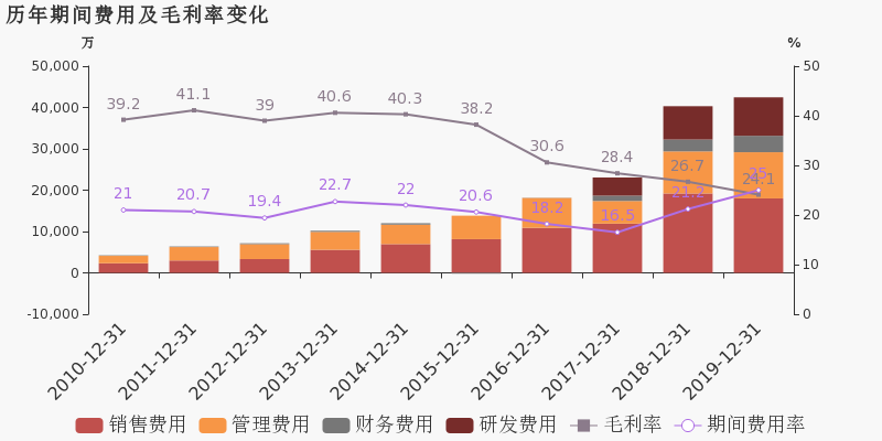 公司2019年營業(yè)成本12.9億,同比下降7.5%,低于營業(yè)收入10.7%的下降速度,毛利率下降2.6%。期間費用率為25%,較上年升高3.8%,對公司業(yè)績形成拖累。經(jīng)營性現(xiàn)金流大幅上升475.2%至3.1億。公司本期研發(fā)投入為1億,同比下降6.4%。研發(fā)投入資本化比例為10.1%。