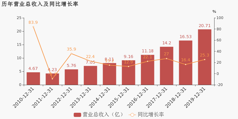 2020年4月29日披露年報,公司2019年實(shí)現(xiàn)營業(yè)總收入20.7億,同比增長25.3%;實(shí)現(xiàn)歸母凈利潤2.3億,同比增長60.9%;每股收益為0.24元。20年一季度公司實(shí)現(xiàn)營業(yè)總收入4億,同比下降13.2%;歸母凈利潤4878.1萬,同比下降13.9%。