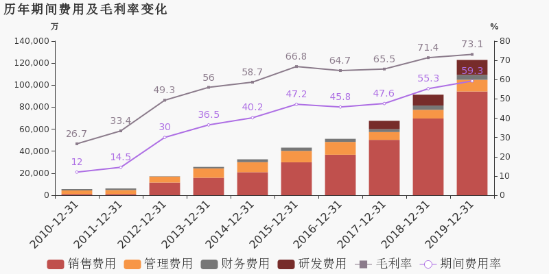 公司2019年?duì)I業(yè)成本5.6億,同比增長18%,低于營業(yè)收入25.3%的增速,導(dǎo)致毛利率上升1.7%。期間費(fèi)用率為59.3%,較上年升高4%,對公司業(yè)績形成拖累。經(jīng)營性現(xiàn)金流由2.9億下降至-5812.7萬,同比下降119.9%。