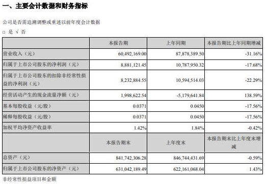 據(jù)了解,本報(bào)告期營業(yè)收入60,492,169.00元,同比減少31.16%;主要系受新冠病毒疫情影響,本報(bào)告期營業(yè)收入較上年同期減少所致。