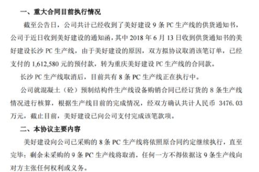 據(jù)了解,協(xié)議的主要內(nèi)容為美好建設(shè)向公司已采購的8條PC生產(chǎn)線將依照原合同約定繼續(xù)執(zhí)行,直至完畢;剩余未采購的9條PC生產(chǎn)線將取消,任何一方不得依據(jù)這9條生產(chǎn)線向?qū)Ψ街鲝埲魏螜?quán)利或義務(wù)。