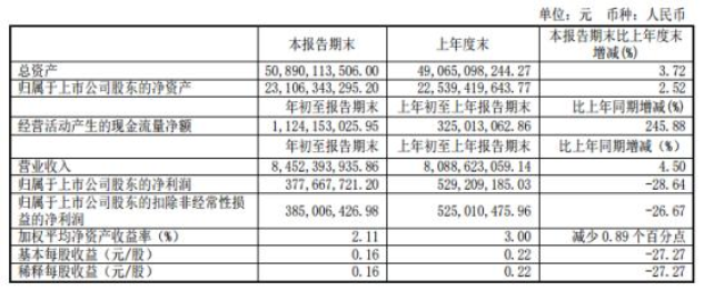 第一季度經(jīng)營活動產(chǎn)生的現(xiàn)金流量凈額為1,124,153,025.95元,比上年同期增長245.88%;基本每股收益為0.16元/股。