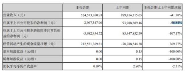 歸屬于母公司所有者的凈利潤(rùn)較去年同期下降96.84%,主要系由于報(bào)告期內(nèi)銷售收入下降所致。