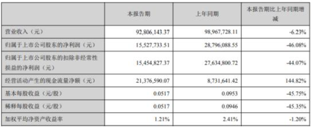 凈利潤較上年同期減少46.41%,主要系由于公司本報告期內利潤減少所致;