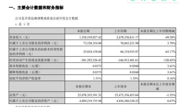 據(jù)了解,本報告期營業(yè)收入1,358,559,027.42元,同比減少49.28%;主要系本期母公司和子公司中色鋅業(yè)的營業(yè)收入較上年同期減少所致。