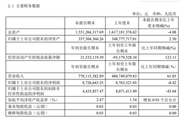 4月30日,引力傳媒(603598)近日發(fā)布2020年第一季度業(yè)績報告,公告顯示,2020年1月1日至2020年3月31日,公司實現(xiàn)營業(yè)收入778,115,382.89元,同比增長61.85%,歸屬于上市公司股東的凈利潤8,726,643.25元,同比下滑0.42%。基本每股收益0.03元/股。