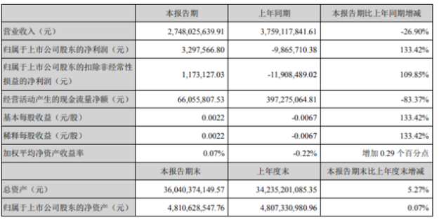5月1日消息,泰達(dá)股份(00065)近日發(fā)布2020年第一季度業(yè)績報(bào)告,公告顯示,2020年1月1日至2020年3月31日,公司實(shí)現(xiàn)營業(yè)收入2,748,025,639.91元,同比下降26.90%;歸屬于上市公司股東的凈利潤3,297,566.80元,同比增長133.42%,基本每股收益為0.0022元/股。