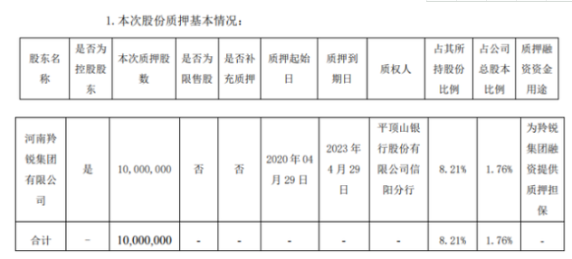 據(jù)挖貝網(wǎng)了解,羚銳制藥控股股東河南羚銳集團(tuán)有限公司向平頂山銀行股份有限公司信陽(yáng)分行質(zhì)押的1000萬股,占公司總股本的1.76%,質(zhì)押期限為2020年4月29日-2023年4月29日。
