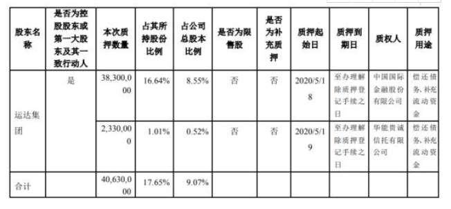 運達(dá)科技股東運達(dá)集團(tuán)質(zhì)押4063萬股 用于償還債務(wù)