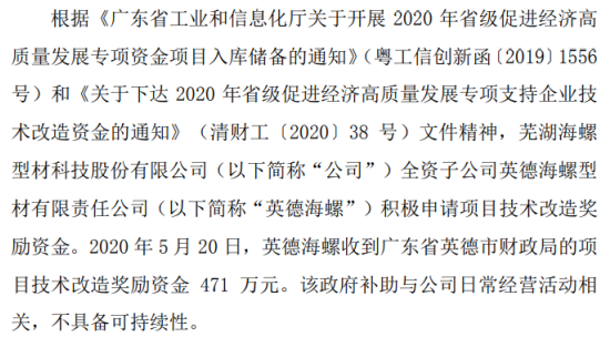 5月21日消息,【海螺型材(000619)、股吧】(000619)發(fā)公告稱,根據(jù)《廣東省工業(yè)和信息化廳關(guān)于開展2020年省級促進(jìn)經(jīng)濟(jì)高質(zhì)量發(fā)展專項資金項目入庫儲備的通知》(粵工信創(chuàng)新函〔2019〕1556號)和《關(guān)于下達(dá)2020年省級促進(jìn)經(jīng)濟(jì)高質(zhì)量發(fā)展專項支持企業(yè)技術(shù)改造資金的通知》(清財工〔2020〕38號)文件精神,蕪湖海螺型材科技股份有限公司全資子公司英德海螺型材有限責(zé)任公司積極申請項目技術(shù)改造獎勵資金。2020年5月20日,英德海螺收到廣東省英德市財政局的項目技術(shù)改造獎勵資金471萬元。該政府補(bǔ)助與公司日常經(jīng)營活動相關(guān),不具備可持續(xù)性。