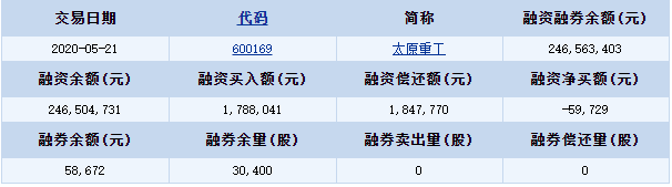 太原重工(600169)2020-05-21融資融券信息顯示,太原重工融資余額246,504,731元,融券余額58,672元,融資買入額1,788,041元,融資償還額1,847,770元,融資凈買額-59,729元,融券余量30,400股,融券賣出量0股,融券償還量0股,融資融券余額246,563,403元。太原重工融資融券詳細(xì)信息如下表: